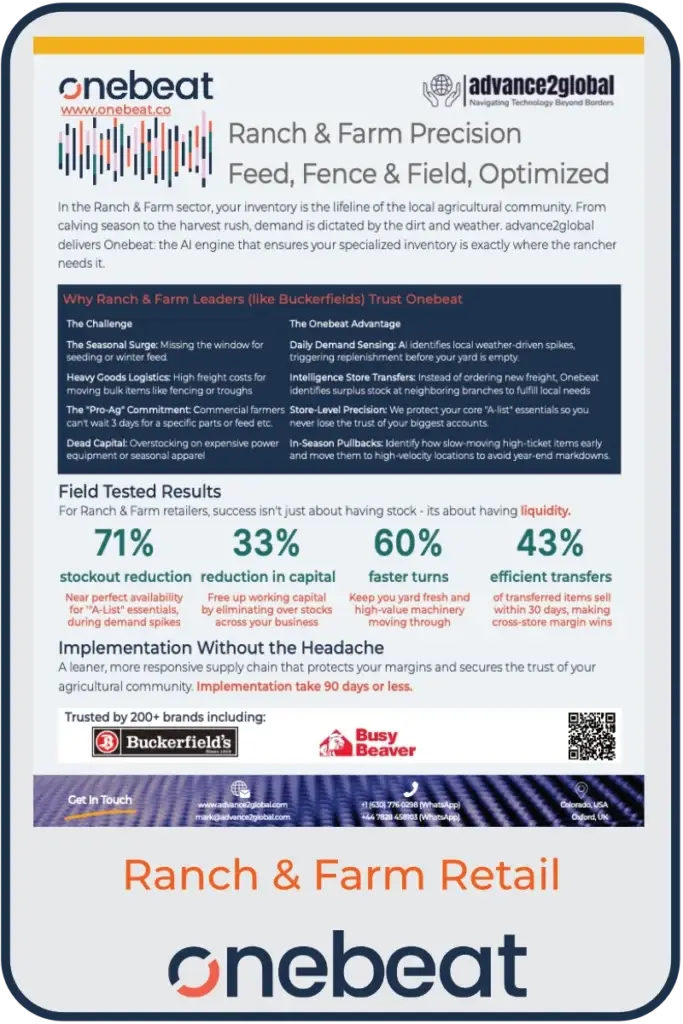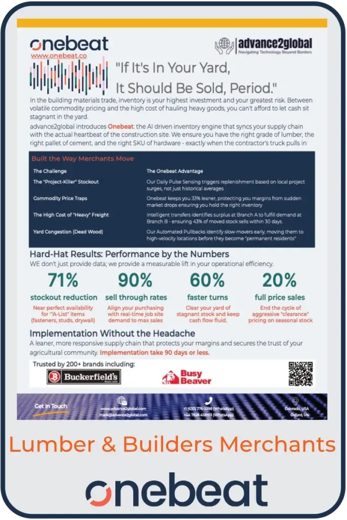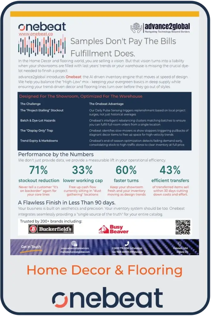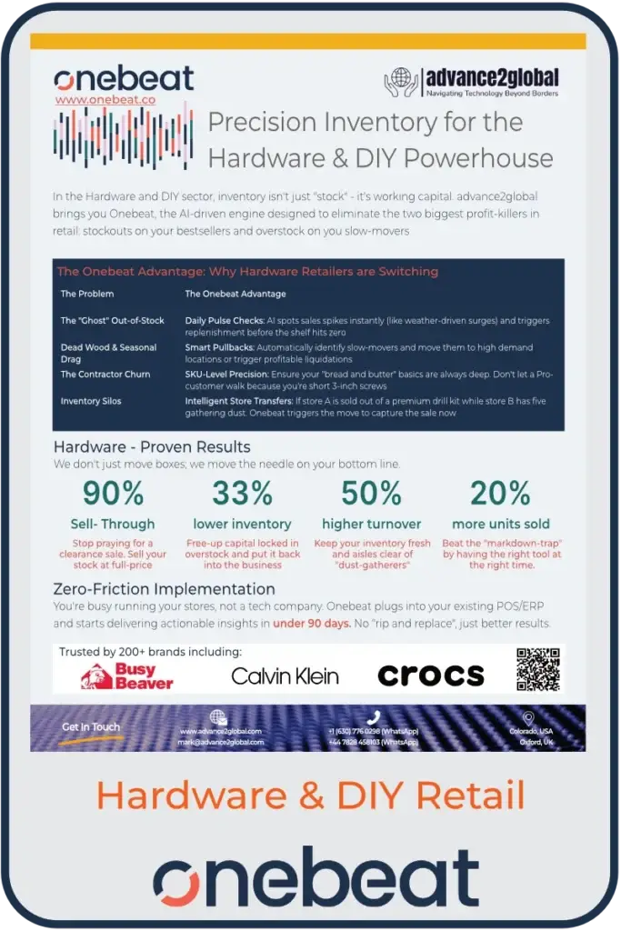 advance2global is pleased to partner withΒ OnebeatΒ to support their continued growth and market expansion. Onebeatβs AI-driven inventory optimization platform helps retailers improve product availability, increase sell-through, and reduce excess inventory through intelligent demand-driven replenishment. Through this partnership, advance2global works alongside the Onebeat team to expand market presence, strengthen strategic partnerships, and support sales and market development initiatives. By combining Onebeatβs proven retail optimization capabilities with advance2globalβs global network and commercial expertise, the partnership aims to accelerate adoption among leading retailers looking to improve operational performance and profitability.